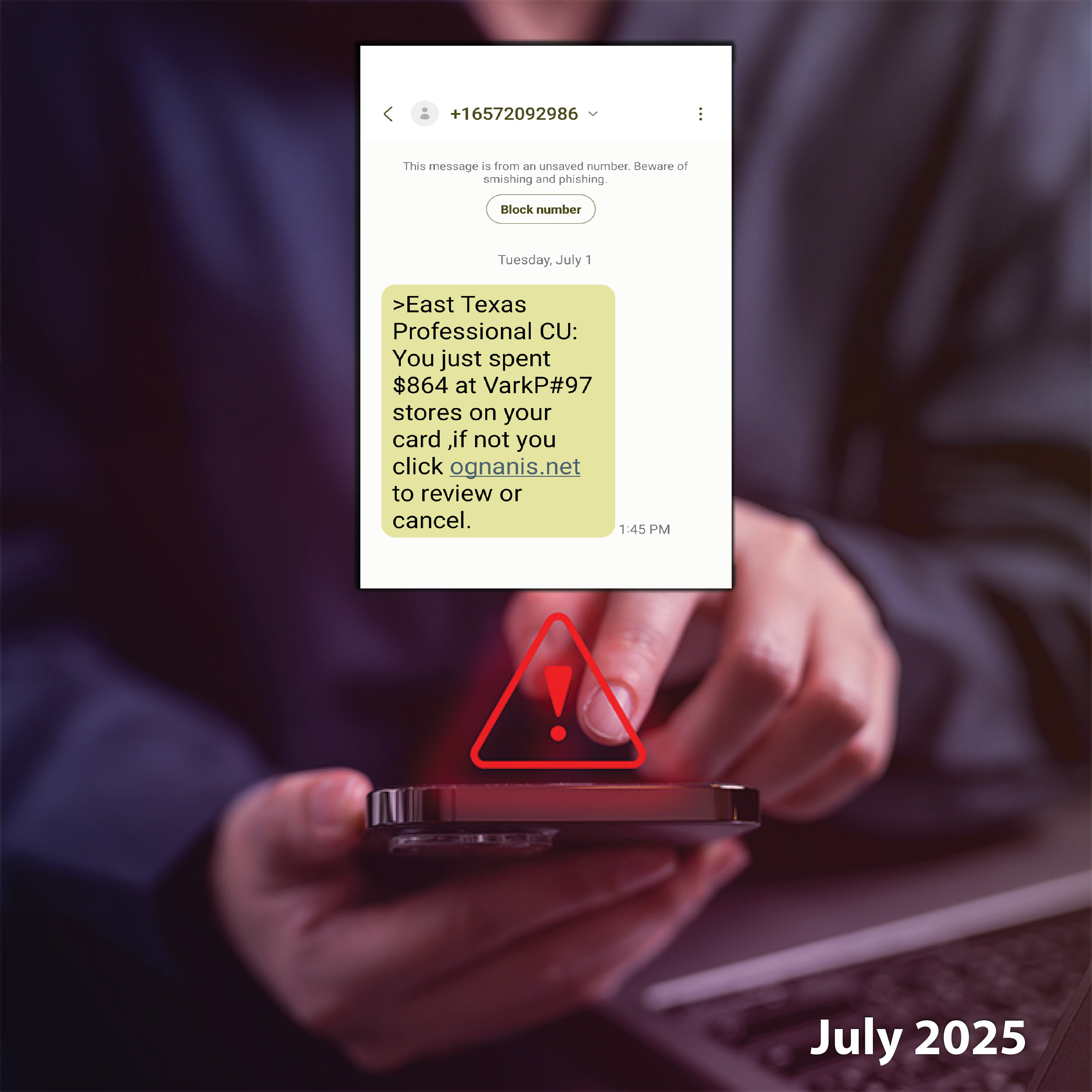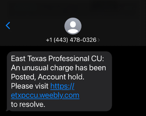 East Texas Professional Credit Union (ETPCU) has been made aware of a recent text scam targeting members. In this version, recipients are alerted about an “unusual charge” on their account and are directed to a suspicious link for resolution.