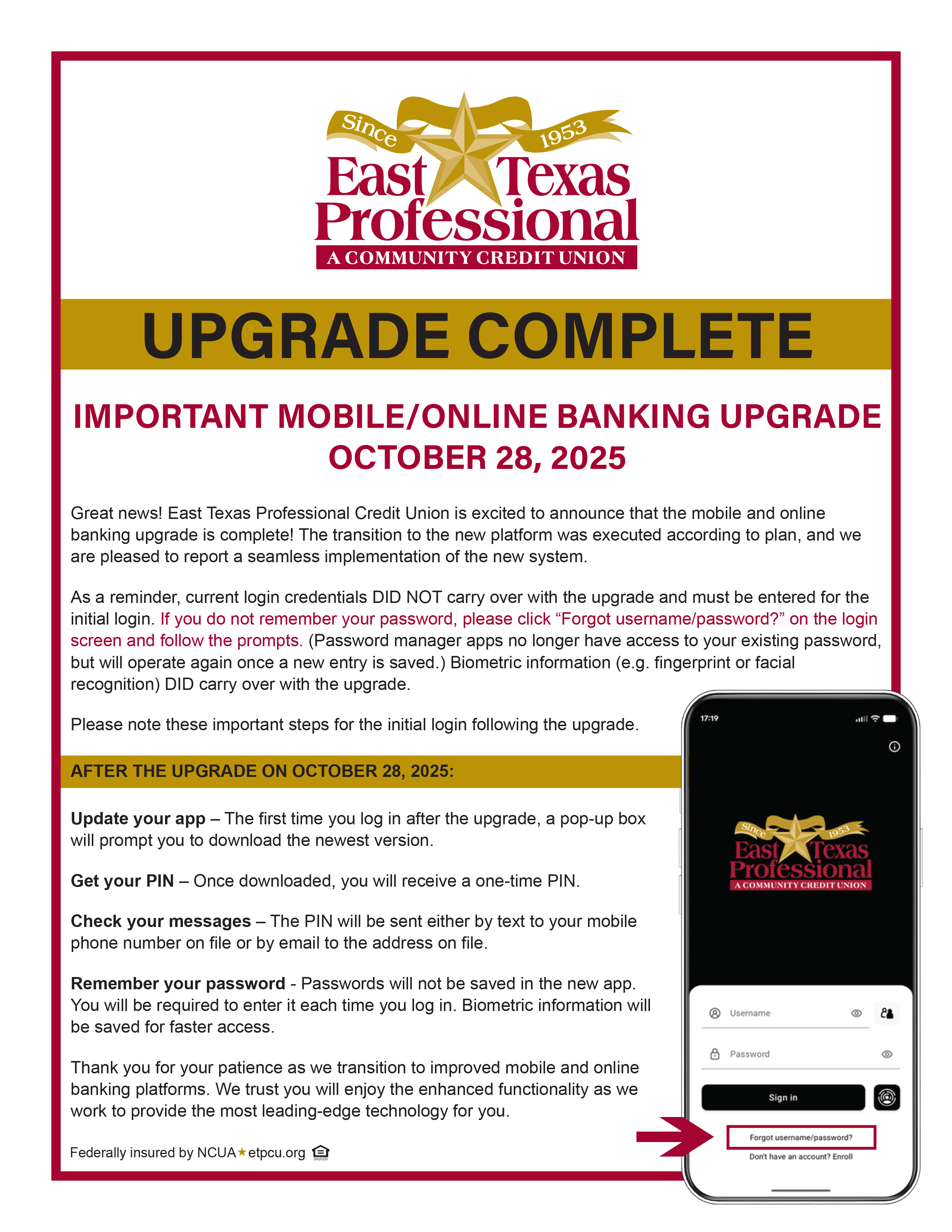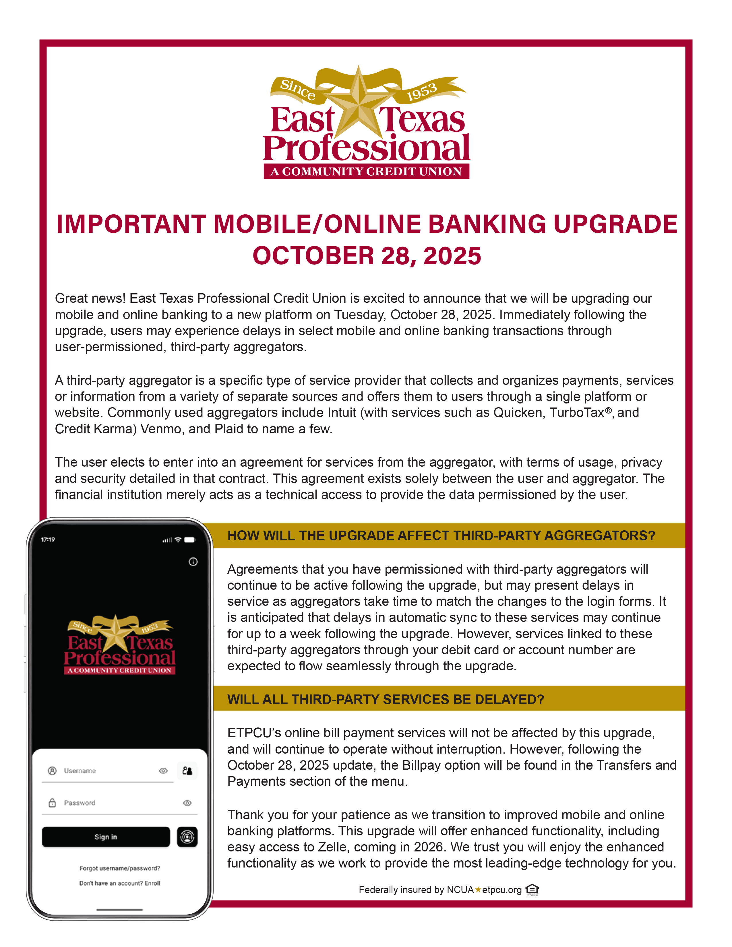 If you have been a victim of this type of activity, we encourage you to file a complaint with the FBI at www.ic3.gov.. For your ETPCU debit/credit cards, we strongly recommend closely monitoring your accounts through Online Banking or our free Mobile App. These services provide tools to reduce your risk of being a fraud victim including Card Control, which allows you to turn your card on or off, and Manage Alerts, which allows you to receive real-time alerts of account activity.